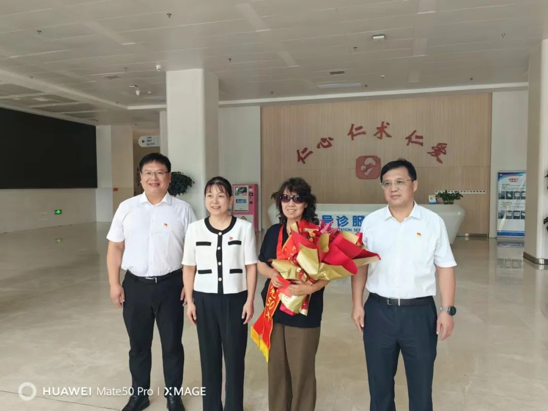 建瓯市委组织部副部长阙云美、建瓯市总医院党委书记、院长黄荣彬,市妇幼保健分院党总支书记、院长陆盛建为老党员陆美珠颁发“光荣在党50年”纪念章。