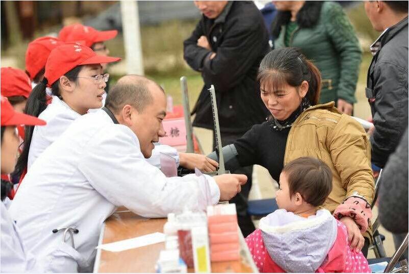 (图为专家团队与卫生院人员座谈、党员志愿者在乡村义诊)
