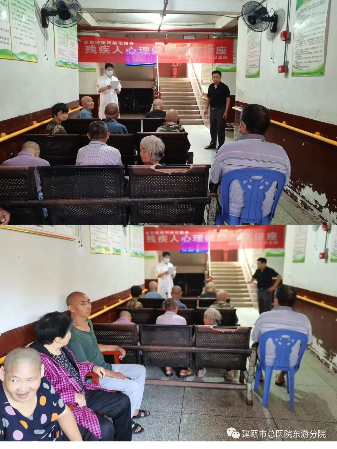 中秋佳节、国庆节来临之际,为弘扬邻里友爱、团结亲善、守望相助的传统美德,不断增强孤寡老人、残障人员的幸福感和获得感,9月28日上午,建瓯市东游中心卫生院全民健康网格化服务团队来到东游镇养老院开展“爱心助残驿站”康复服务活动,为养老院内的老人、残障人员送去节日的祝福,并为他们进行健康体检,开展残疾人心理健康教育讲座,让他们真切感受到“家门口”的医疗服务。医务人员早早来到养老院,迅速做好各项准备工作,医务人员用通俗易懂的语言与老人和残障人员亲切交谈,详细询问他们的身体状况,悉心为他们测量血压、血糖、针对测量结果就饮食、用药、生活习惯、注意事项的等各方面进行指导;随后为他们进行抽血、心电图、彩超等健康体检服务。“大妈,您的血压有点高,平时有没有按时吃药呀?”“大爷,您近期有没有哪里不舒服?您跟我说说。”活动现场,医护人员为他们测血压、血糖,耐心解答他们提出的健康问题,呈现着一片繁忙的景象,医护人员根据每个人不同健康状况,从如何正确服药、良好生活习惯、合理饮食上给予科学的指导,耐心向他们普及健康知识和注意事项,让他们在充分认识自身健康状况的基础上,有针对性的采取一些预防疾病措施,树立健康生活的理念。为残疾人开展心理健康讲座
