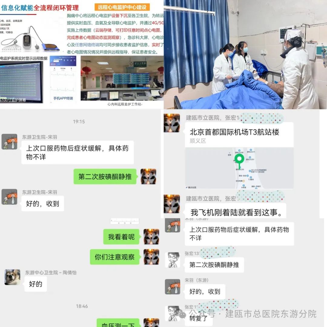 12月5日18时20分,夜幕悄然降临,一位48岁的女性患者詹某某因突发胸闷被紧急送入医院。这位患者到达医院前已经胸痛50分钟,情况十分危急。接诊后,陶倩怡和宋羽医生迅速行动,对患者进行了详细的问诊。凭借专业的医学素养和丰富的临床经验,她们判断患者可能存在心脏方面的问题。于是,两位医生立即分别为患者紧急床边心电图及测血压。心电图的结果让人心头一紧——心动过速!血压102/75mmHg,这一数值虽然处于正常范围,但结合心动过速的情况,患者的状况依然十分危急。她们立即通过东游中心卫生院胸痛联络群迅速将心电图及患者情况上传汇报。“又是心动过速, 立即接上远程心电!”此时的张宏主任正在北京出差,刚刚下飞机的他,还没来得及喘口气,看到群信息后立即回复。18时37分,远程心电监护顺利接通。张宏主任一边观察波形,一边指导着东游中心卫生院的医护人员进行下一步操作。18时40分,5%葡萄糖注射液20ml+胺碘酮150mg的缓慢静脉推注开始......18时56分,患者的心率已经开始逐渐稳定下来。于19时19分,远程心电监护屏幕上显示出令人振奋的一幕——患者成功转复为窦性心律!这意味着,患者的心脏已经恢复了正常的跳动节奏,病情得到了有效控制。在张宏主任远程指导下,以最短时间该患者复律成功。东游中心卫生院与建瓯市总医院胸痛中心张宏主任紧密配合,跨越一千公里的远程守护,共同上演了一场生命的大救援。这场救治行动的成功,不仅得益于医护人员的专业素养和快速响应,更得益于心电一张网的强大支撑。它不仅让基层卫生院能够及时联系到上级医院的专家进行远程指导,还让患者在基层卫生院就能享受到高质量的医疗服务,避免了往返就医的奔波与风险。类似的抢救在东游中心卫生院已达到30例,成功率达100%,此次抢救再次展现了心电一张网在临床工作中的卓越应用及至关重要性。心电一张网,如同一张守护生命的神奇之网,通过信息化手段,将各级医疗机构紧密联系在一起,在临床工作中,它打破了时空的限制,让市级专家的技术水平能够迅速传递到基层。无论医生身处何地,只要有需要,就能通过这张网为患者提供及时、准确的诊断和治疗建议。实现了远程心电监护和远程医疗指导,为患者提供了更加便捷、高效的医疗服务。对于基层医疗机构而言,心电一张网是强大的技术支持和保障。它让基层医生在面对复杂病情时不再孤立无援,能够迅速获得上级专家的指导,提高了诊断的准确性和治疗的有效性。同时,也为患者节省了时间和精力,让他们在最短的时间内得到最好的救治。对于患者来说,心电一张网是生命的希望之光。在突发疾病时,能够迅速得到专业的医疗救助,无需长途跋涉前往大医院,大大降低了病情恶化的风险。它为患者提供了更加便捷、高效的医疗服务,真正实现了 “小病不出村、大病不出县” 的目标。让优质的市级医疗资源下沉到基层,让基层的群众可以足不出户就能享受到市级专家的诊疗服务。我们将继续加强心电一张网的建设和推广,让更多的人享受到优质、高效的医疗服务。同时,我们也呼吁广大群众,要时刻关注自己的身体健康,一旦出现不适症状,及时就医,切勿延误病情。