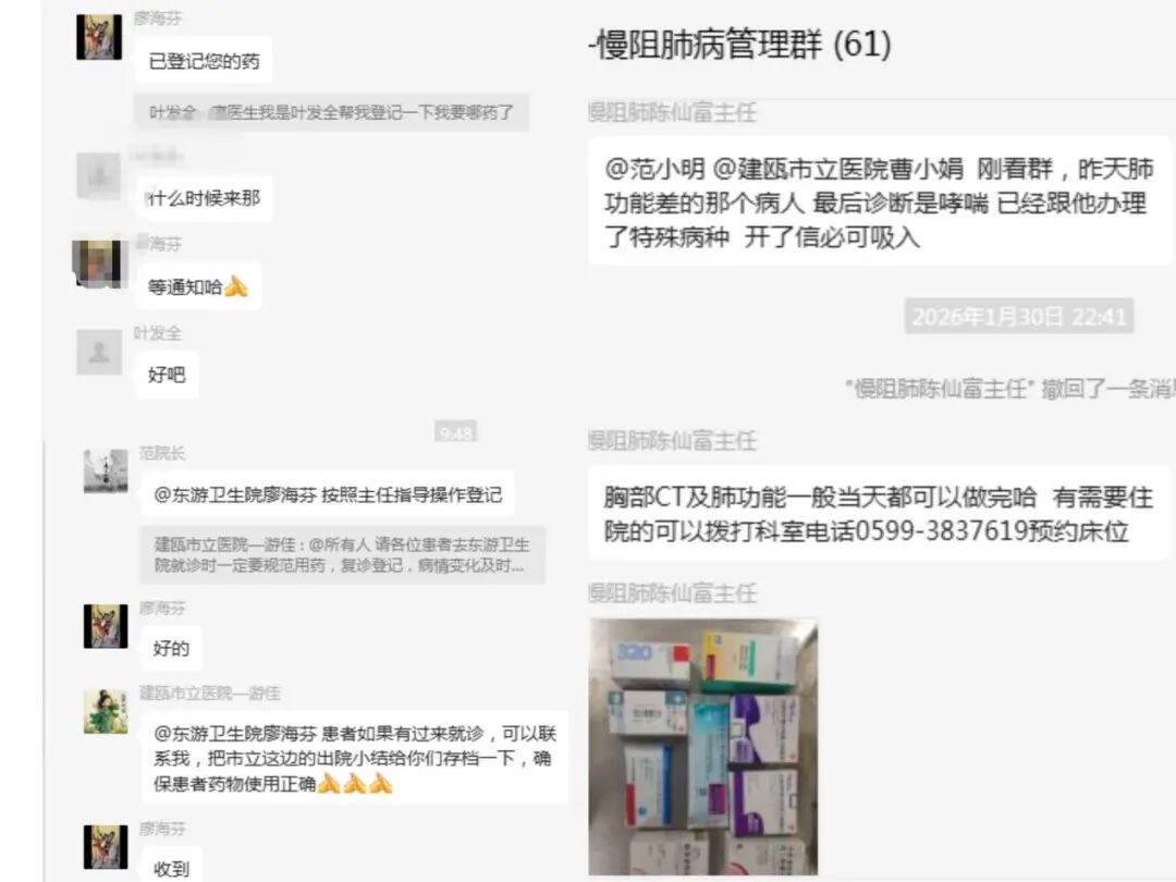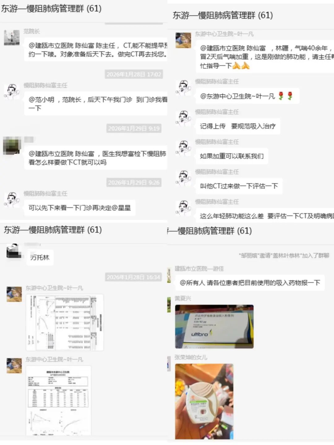 “游主任,我这两天总觉得气短、咳痰多,家里的吸入剂快用完了,还能按之前的剂量用吗?我把上周的肺功能检查报告拍群里了!”“刘叔,报告我看过了,肺功能指标控制得还行,吸入剂可以继续按原剂量使用,我已经让廖医生帮你预留了药品,你直接去卫生院领取就行,不用再跑市直医院排队了!”东游中心卫生院慢阻肺医患交流群里,这样暖心的互动每天都在上演。借助市立医院慢阻肺诊疗专家下沉的契机,市直医院专家每日在线坐诊答疑。针对患者气短、咳嗽、咳痰等症状描述,结合既往病历、肺功能检查报告和用药记录等数据,精准给出诊疗建议和用药调整方案,同时提供日常护理指导。卫生院医护人员同步专家坐诊时间、药品储备及预防保健知识,协助患者预约面诊和办理药品领取手续,实现诊疗服务无缝衔接。患者在卫生院完成检查后数据实时同步至医患群,无需重复携带纸质报告或重复检查,大幅降低就医成本。
