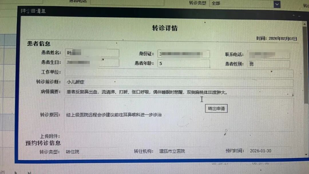 1月28日,我院门诊接诊患儿叶某某,家长诉孩子存在反复鼻出血、流清涕症状,同时伴有打鼾、张口呼吸,甚至睡眠时偶有憋醒情况。接诊医生查体发现患儿双侧扁桃体肿大,结合症状拟诊小儿鼾症。考虑到病情需要专业诊疗评估,我院立即通过微信群联系建瓯市立医院耳鼻喉科专家开展线上远程问诊。