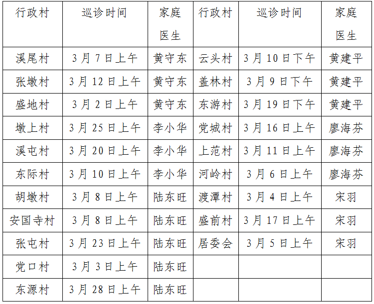 东游镇“4+N”全民健康医防融合网格化服务 2026年3月巡诊时间通知 家庭医生的巡诊机制 家庭医生签约团队每月必须到所管辖村进行巡诊一次,主要任务1、为乡村医生及健康网格员摸排到的村民进行诊治(家庭医生的诊察费用归乡村医生);2、对本村下属的自然村进行巡诊,便于边远群众就诊;3、对行动不便、年老体弱、高血压、糖尿病等慢病控制不满意的人群进行入户巡诊、随访。 本文来源:建瓯市东游中心卫生院 编辑/程秀兰 审核/邹丽嫔 终审/范小明