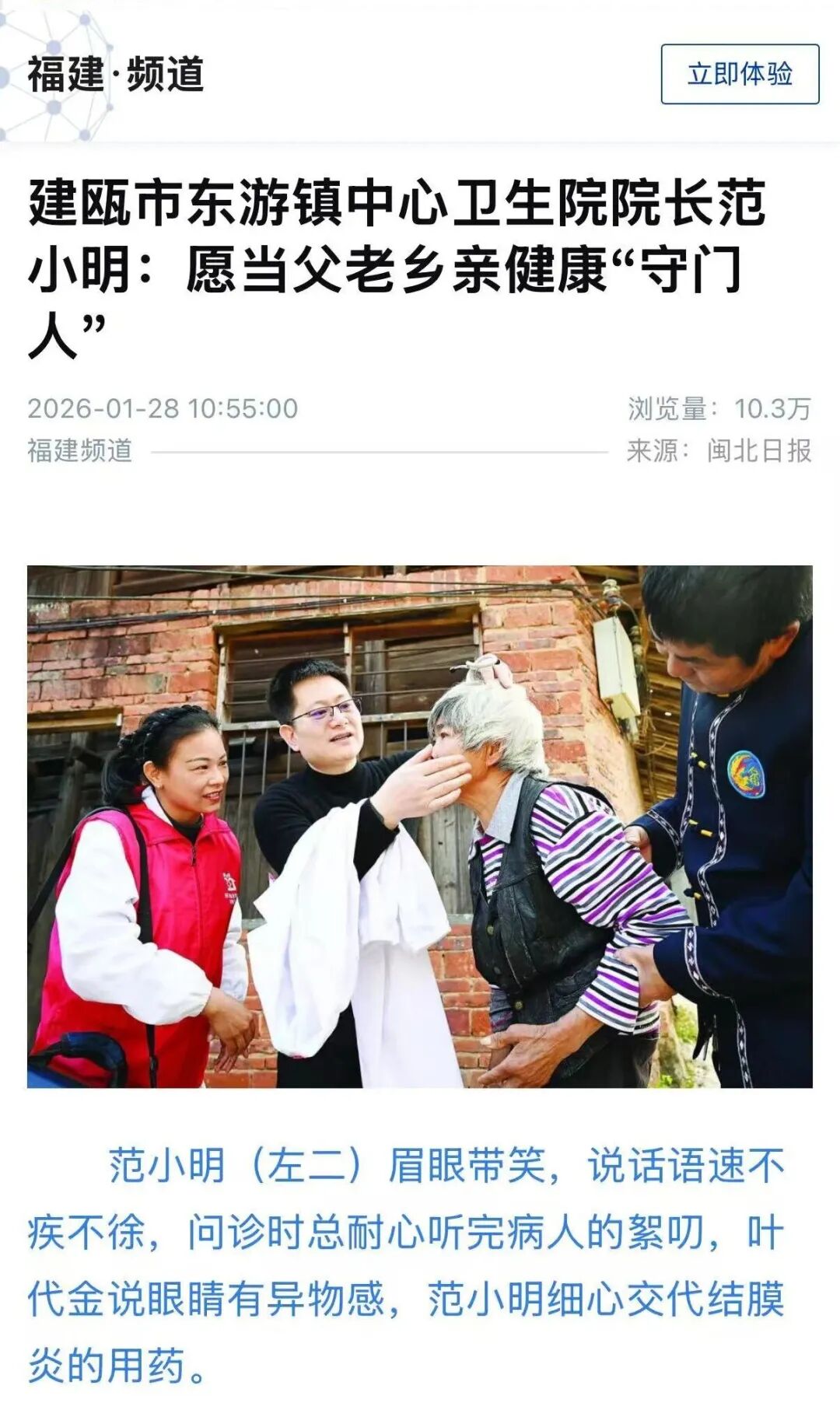 在建瓯市东游镇,提起中心卫生院院长范小明,百姓无不竖起大拇指。他眉眼带笑,说话不疾不徐,问诊时总能耐心听完病人的絮叨,再温和给出建议;温润的嗓音里,专业术语总能变成通俗易懂的大白话,末了还会反复叮嘱注意事项,让人心里暖意融融。