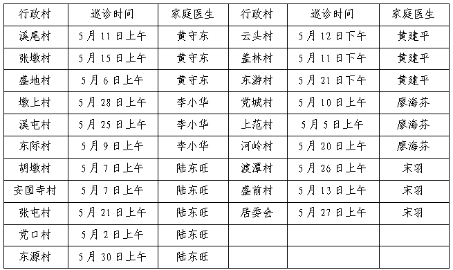 东游镇“4+N”全民健康医防融合网格化服务 2026年5月巡诊时间通知 家庭医生的巡诊机制 家庭医生签约团队每月必须到所管辖村进行巡诊一次,主要任务1、为乡村医生及健康网格员摸排到的村民进行诊治(家庭医生的诊察费用归乡村医生);2、对本村下属的自然村进行巡诊,便于边远群众就诊;3、对行动不便、年老体弱、高血压、糖尿病等慢病控制不满意的人群进行入户巡诊、随访。 ▌本文来源:建瓯市东游中心卫生院 编辑:程秀兰 责编:邹丽嫔 审核:范小明